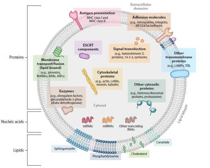 膜內蛋白主要包括熱休克蛋白家族((HSP60, HSP70, HSPA5, CCT2 和HSP90)、代謝類(lèi)的酶(GAPDH,烯醇化酶 1, 醛縮酶 1, PKM2, PGK1)、核糖體蛋白(RPS3)、信號轉導因子(黑色素瘤分化相關(guān)因子, ARF1, CDC42, )粘附因子(MFGE8、整合素)、細胞骨架蛋白以及泛素。