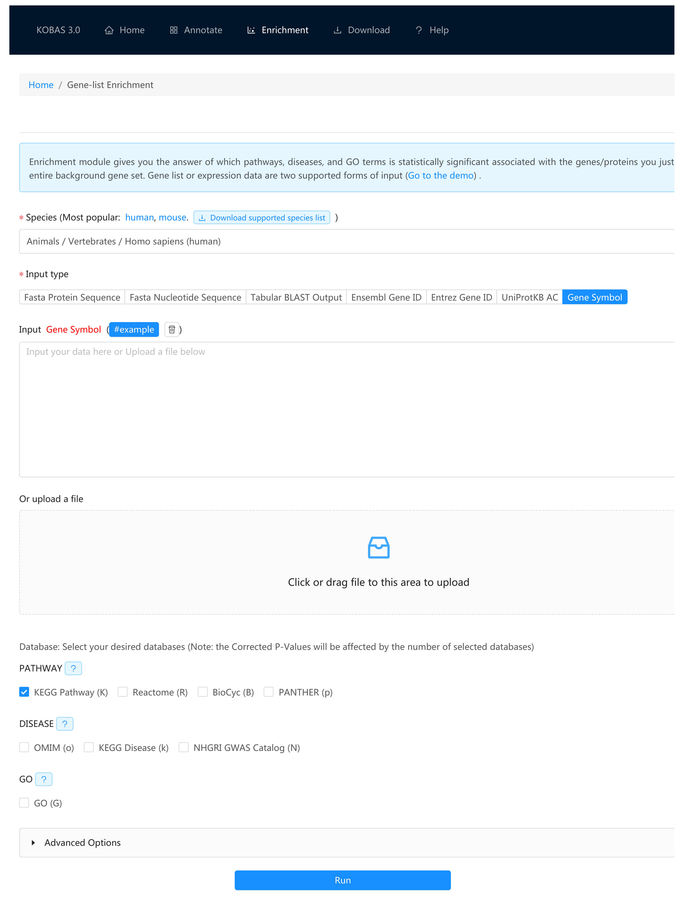 在彈出的新頁(yè)面中,選擇對應的Species、Input type,輸入geneID,選擇富集的數據庫Database,點(diǎn)擊run即可進(jìn)行富集分析,界面如下: