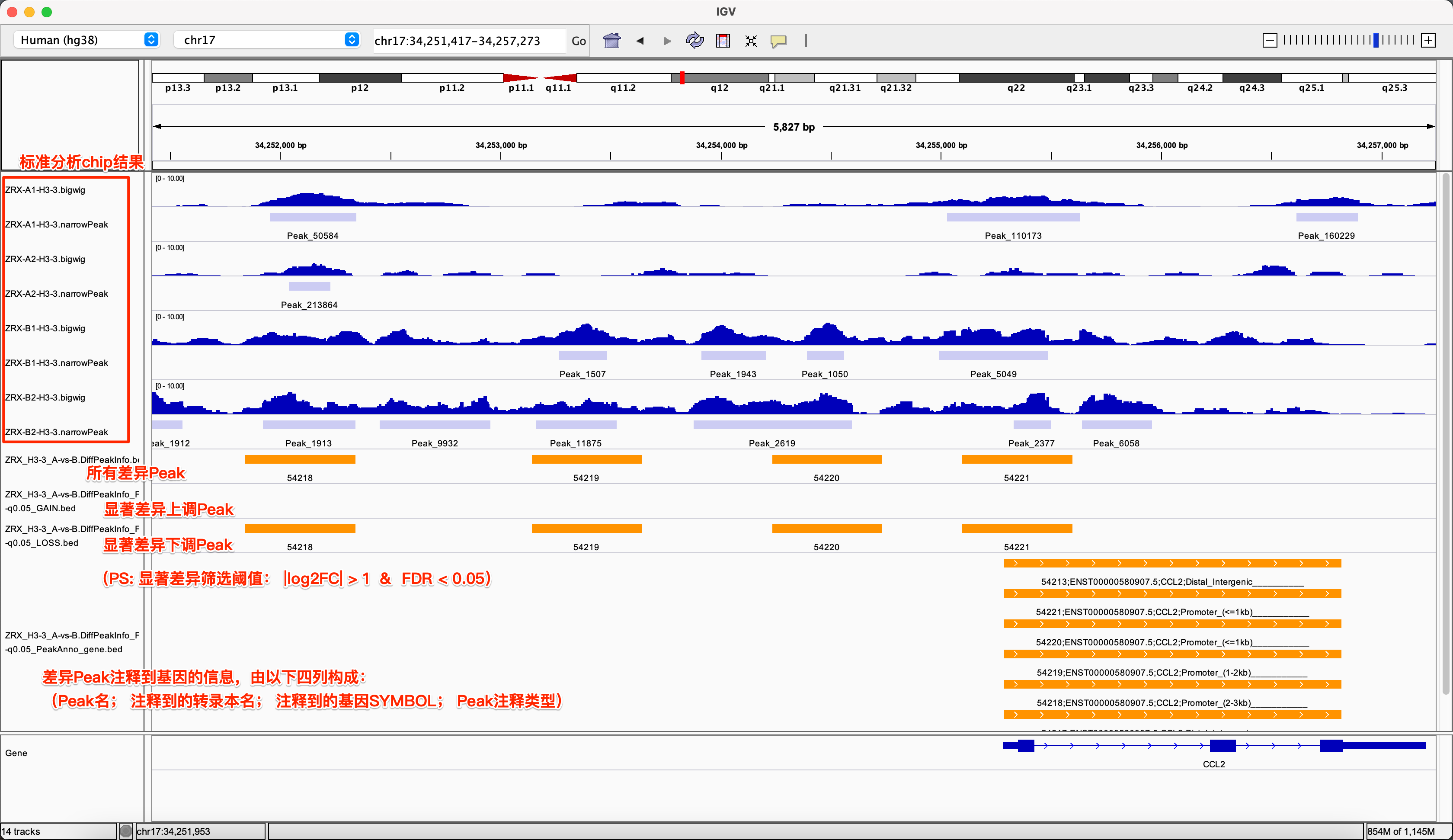 ??一個(gè)示例如下,在該IGV中通過(guò)可視化,可讀出的信息有:在 A vs B 的差異Peak對比中, Peakname 為 54218, 54219, 54220, 54221 的這些Peak比較區域, A相對B具有顯著(zhù)下調趨勢,它們都被臨近注釋到CCL2基因上,注釋類(lèi)型為3K內的Promoter。