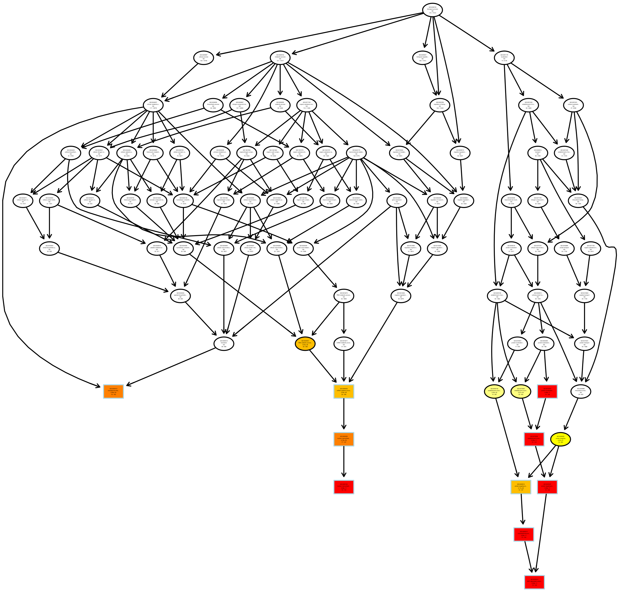 每個(gè)節點(diǎn)代表一個(gè)GO術(shù)語(yǔ),方框代表的是富集程度為T(mén)OP5的GO,顏色的深淺代表富集程度,顏色越深就表示富集程度越高,每個(gè)節點(diǎn)上展示了該TERM的名稱(chēng)及富集分析的padj