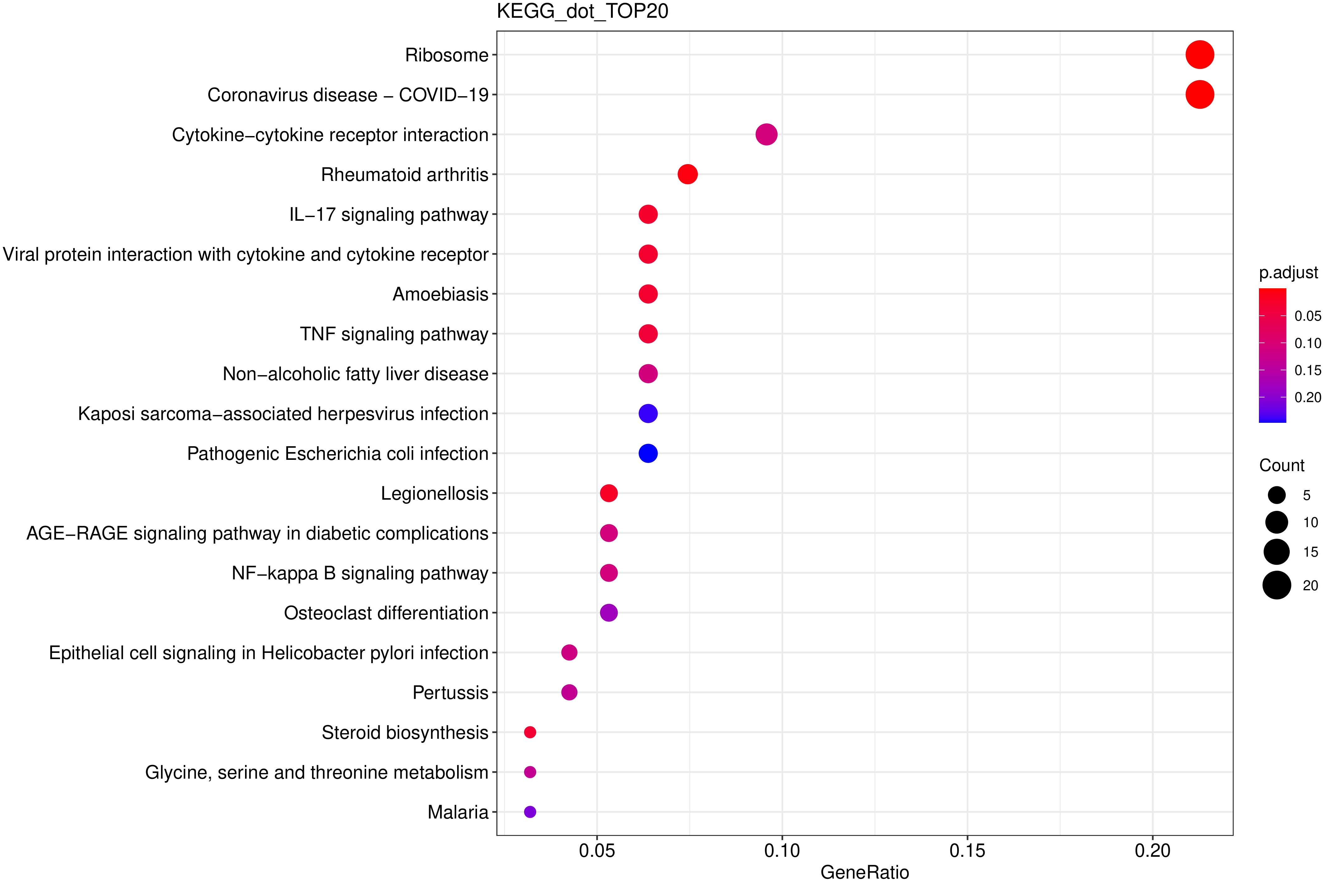 ??從KEGG富集結果中,選取最顯著(zhù)的20個(gè)KEGG通路繪制散點(diǎn)圖進(jìn)行展示,若不足20個(gè),則繪制所有通路,如下圖所示。圖中橫坐標為注釋到KEGG通路上的差異基因數與差異基因總數的比值,縱坐標為KEGG通路,點(diǎn)的大小代表注釋到KEGG通路上的基因數,顏色從紅到紫代表富集的顯著(zhù)性大小。
