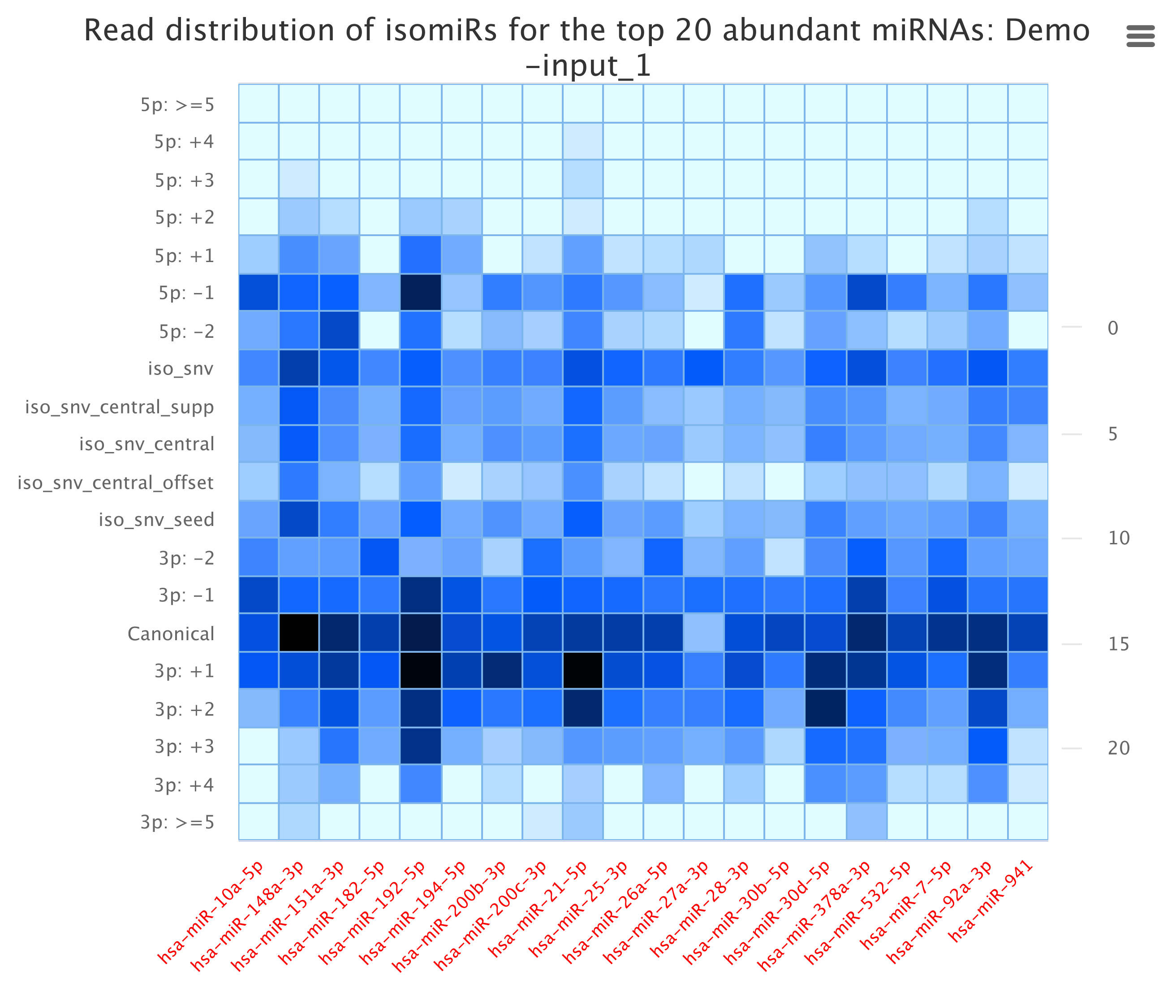 ??我們通過(guò)序列與miRbase比對的情況,將各個(gè)miRNA Reads進(jìn)行isomiR識別,并同時(shí)匯總至miRNA reads 注釋結果中,分類(lèi)統計,并選取表達量較高的前20個(gè)mirna進(jìn)行各類(lèi)IsomiRs表達豐度統計。