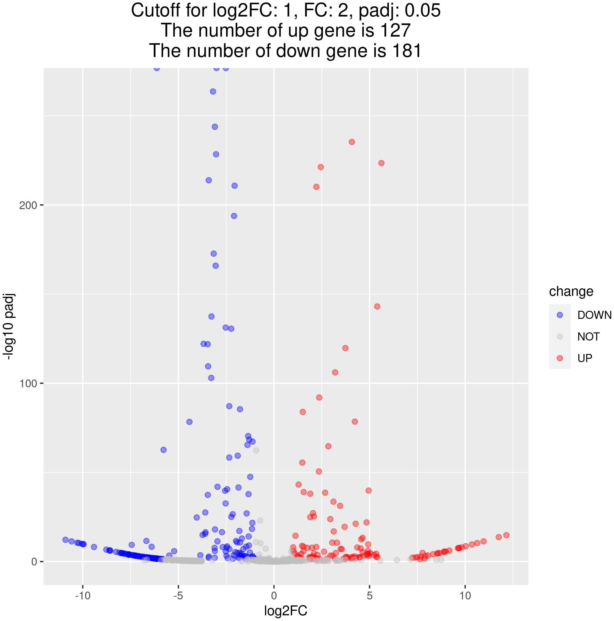 圖中橫坐標為log2FoldChange值,縱坐標為-log10padj或-log10pvalue,藍色的虛線(xiàn)表示差異基因篩選標準的閾值線(xiàn)