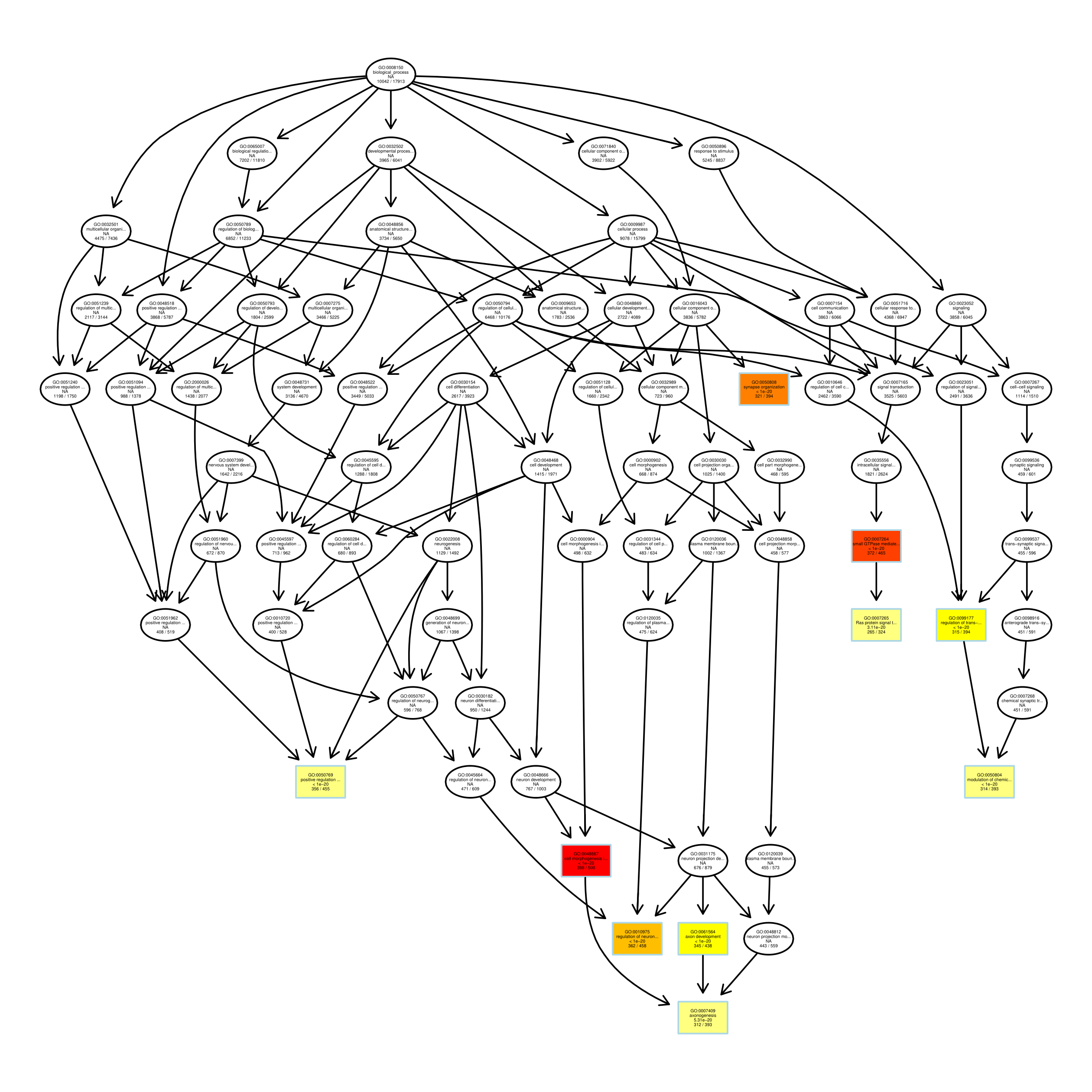 每個(gè)節點(diǎn)代表一個(gè)GO術(shù)語(yǔ),方框代表的是富集程度為T(mén)OP5的GO,顏色的深淺代表富集程度,顏色越深就表示富集程度越高,每個(gè)節點(diǎn)上展示了該TERM的名稱(chēng)及富集分析的padj