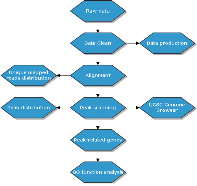 ??質(zhì)檢后的reads,采用trim-galory對reads進(jìn)行去接頭,去接頭后,再次對reads進(jìn)行質(zhì)檢,主要檢測接頭是否去除干凈。去除接頭的reads,用hisat2軟件將reads mapping到基因組上,得到reads在基因組上的信息,即.bam文件,將input的.bam文件與IP的.bam文件,通過(guò)MASC2進(jìn)行 peak calling,得到peak文件,即為.bed文件,對得到的peak進(jìn)行注釋?zhuān)⑦M(jìn)行功能分析。